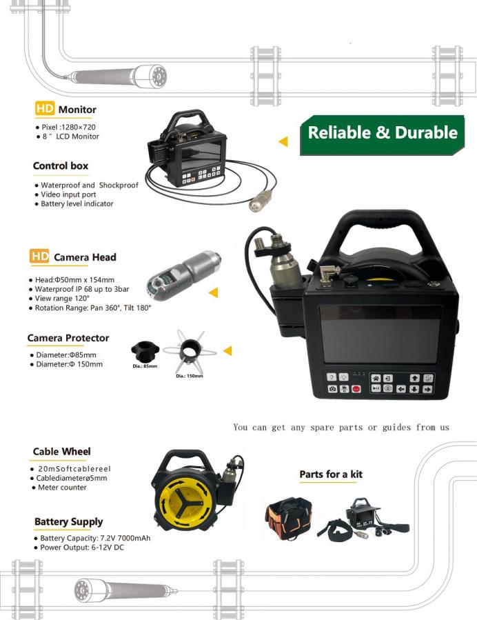 Systém je dodávaný s 20 m flexibilným káblom, ktorý umožňuje ľahký prístup aj do tých najmenších priestorov. Kábel je úhľadne uložený v tele jednotky, čo zvyšuje komfort pri preprave a skladovaní. Funkcia odvinutej vzdialenosti vám poskytne presné informácie o tom, koľko metrov kábla je už odvinutých. Kábel je s duálnou kamerou hlavicou, ktorá umožňuje súčasný priamy aj bočný pohľad s rotáciou 360 ° pre maximálne pokrytie priestoru. Vyhotovený video záznam je v HD kvalite (1920 x 720 px) a so zvukom. Kamerová jednotka je z odolného nerezového materiálu s rozmermi 50 mm x 154 mm.