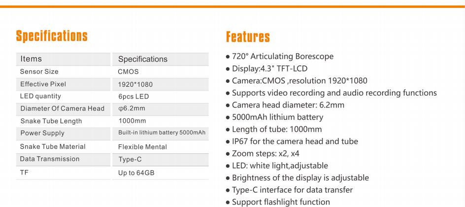 Vďaka dvom pokročilým kamerám CMOS ( jedna s pohľadom spredu, druhá s pohľadom zboku) , vysokokvalitnému osvetleniu LED, 4,3" displeju LCD a funkcii nahrávania videa a fotografií poskytuje model OXE ED-801 maximálnu účinnosť, jasný obraz a pohodlnú obsluhu. Je ideálny pre priemysel, automobilový priemysel, stavebníctvo, inšpekciu potrubia, elektroinštalácie a domácu údržbu.