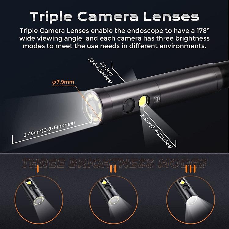 Jednou z kľúčových vlastností tejto kamery je trojitý objektív, ktorý zaisťuje širší uhol pohľadu a umožňuje inšpekciu z viacerých uhlov bez nutnosti premiestnenia sondy. Kamera tiež ponúka praktické funkcie, ako je 3× digitálny zoom, otočenie obrazu o 180 ° a nastaviteľné LED osvetlenie, ktoré zaisťujú spoľahlivý výkon aj v tmavých alebo zle osvetlených prostrediach. Vodeodolná sonda s krytím IP67 je ideálna na použitie v náročných podmienkach, napríklad v potrubiach, ventilačných systémoch alebo strojných súčiastkach.
